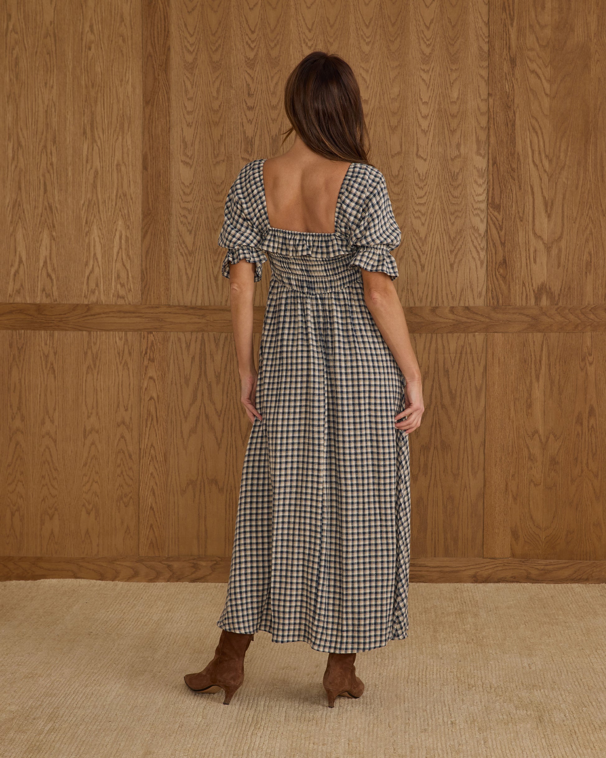 Our Birdie Dress features a smocked bodice, puff sleeves, ruffle trim, and a side slit for an effortlessly feminine silhouette.