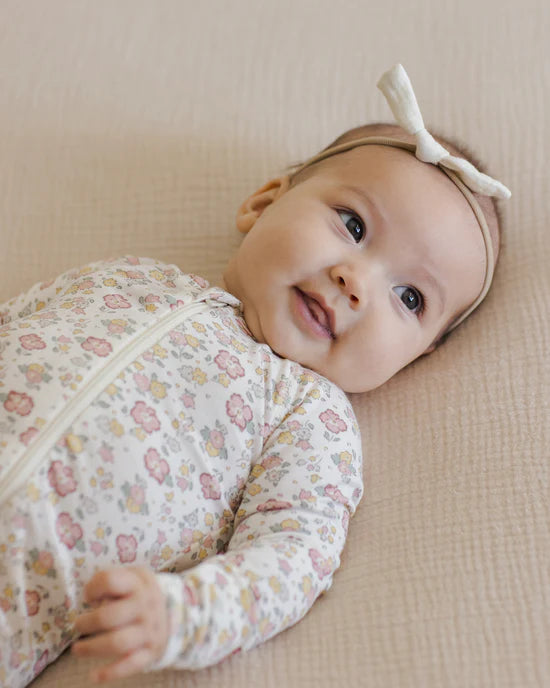 Featuring ‘bloom’ print on our 'ivory' hue. This darling floral print encapsulates vintage nursery feels.