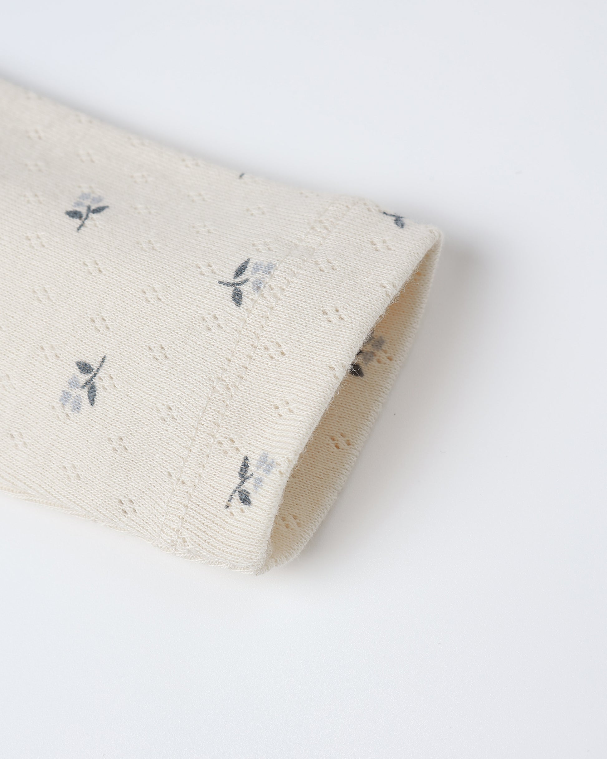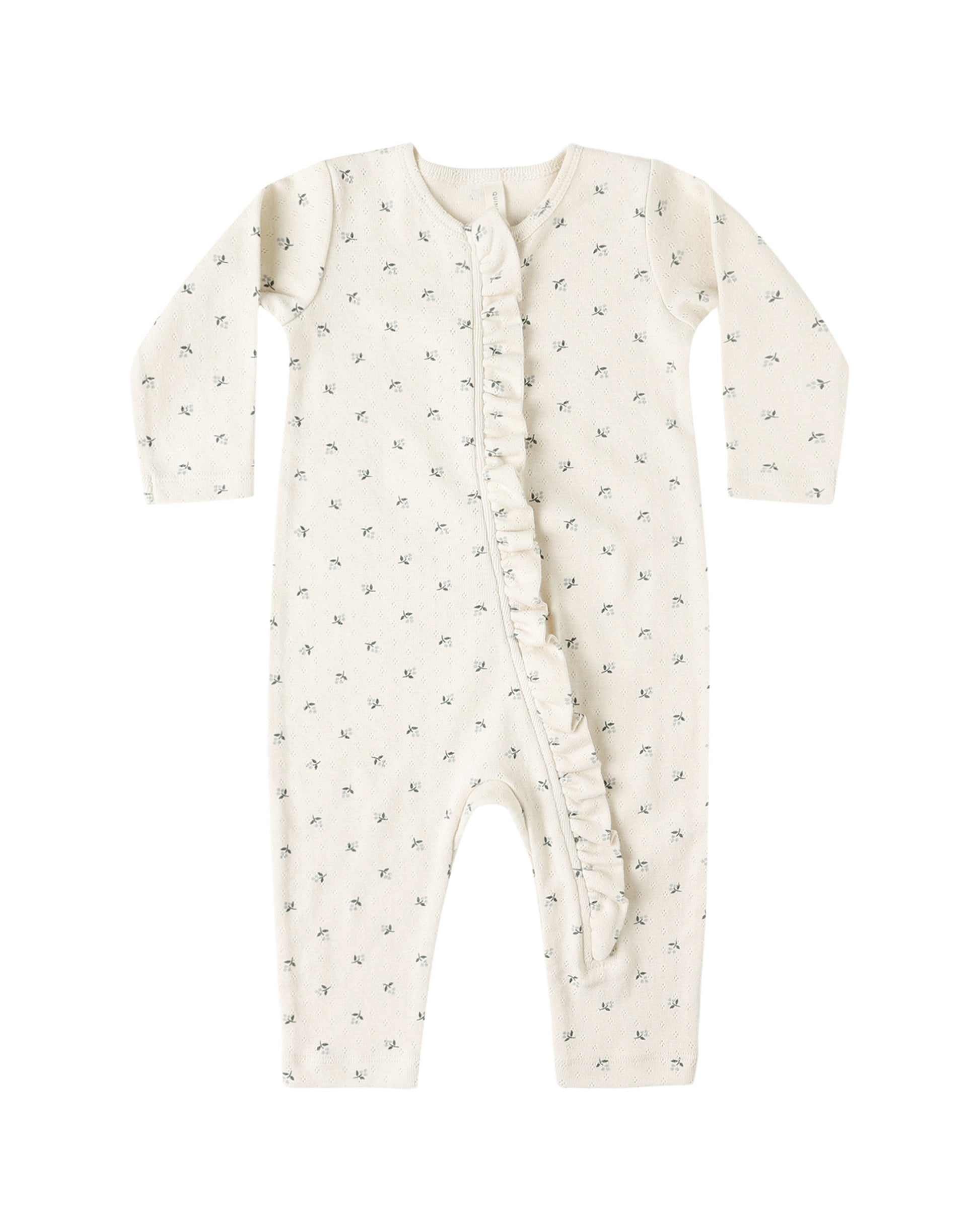 This sweet pointelle jumpsuit features delicate ruffle detail along the zipper, combining cozy comfort with timeless charm.