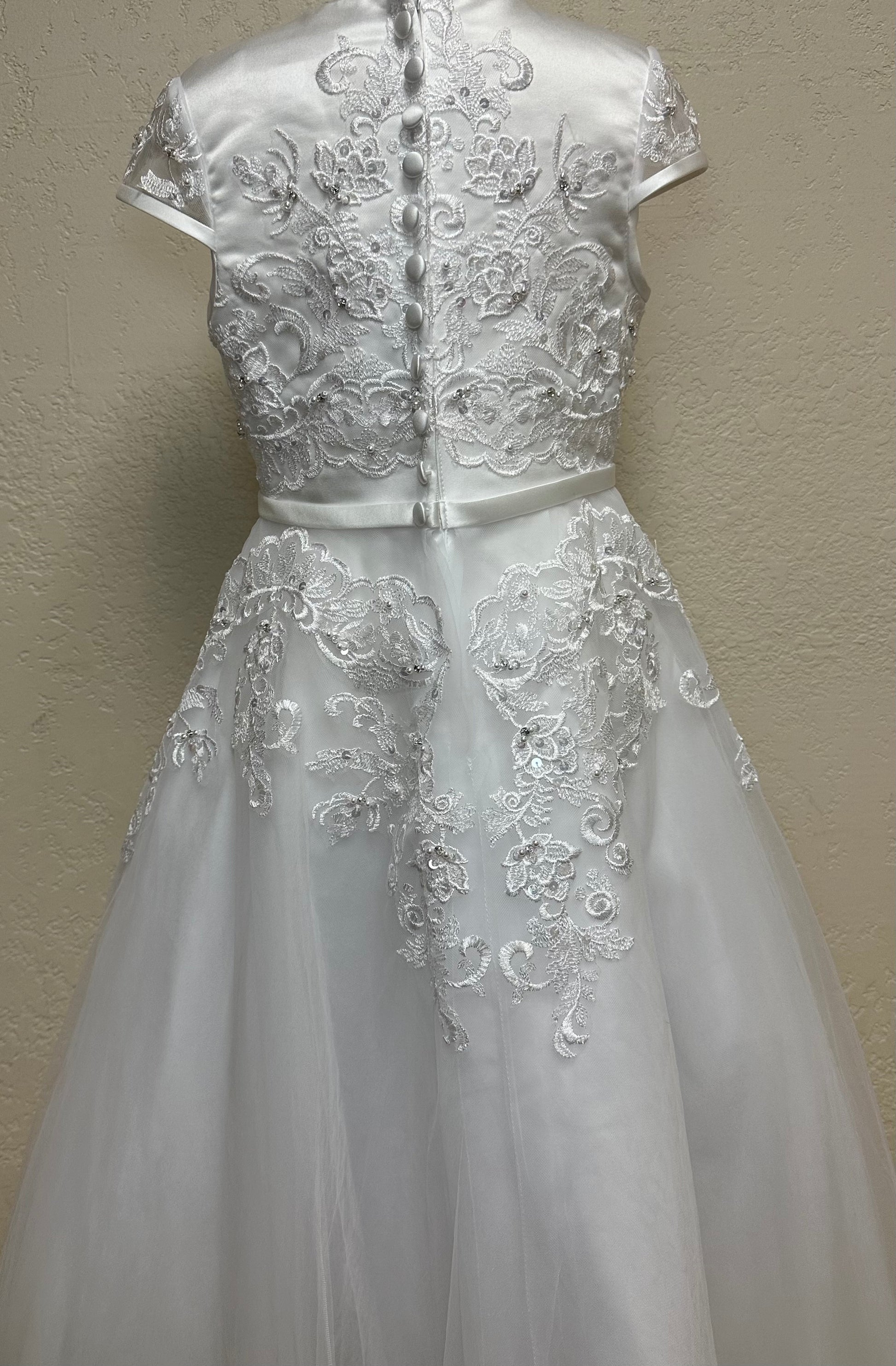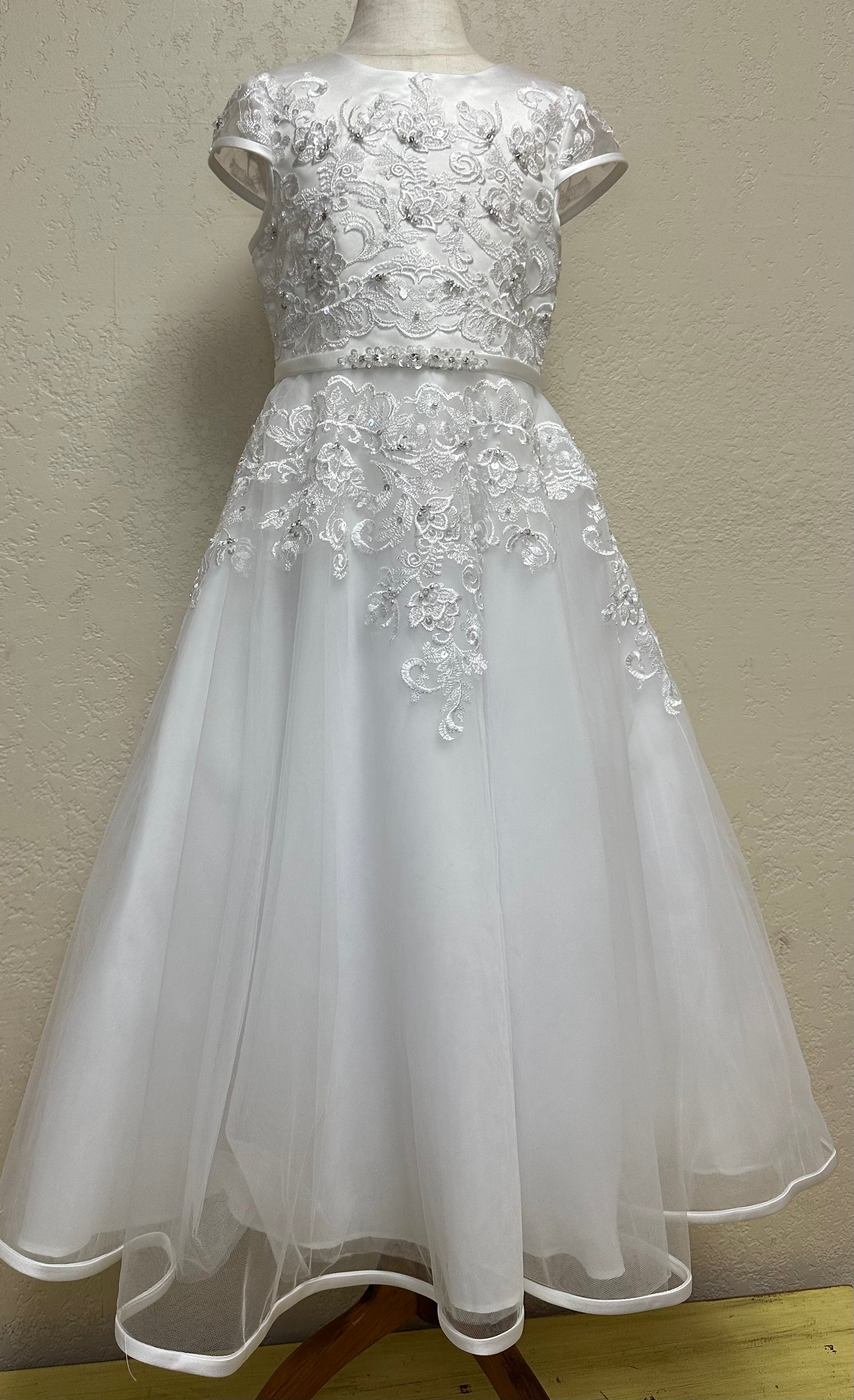 The Cap Sleeve Floral Beaded Waist Dress features a tea-length design adorned with exquisite lace appliqué, sequins, and tiny pearls. Its cap sleeves and structured fit enhance the silhouette, while the beaded waist provides subtle elegance. The zipper closure with a covered satin button ensures a secure fit, offering both comfort and style.
