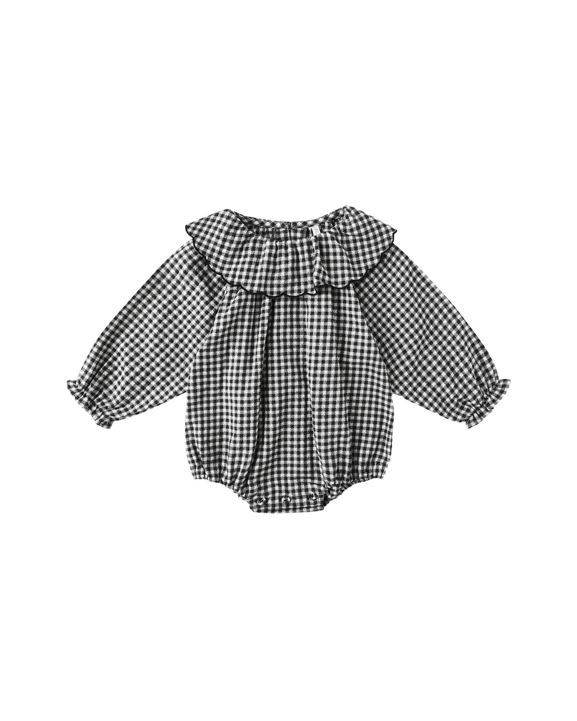 This Colette Romper in black and white gingham features a delicate ruffled collar for a charming touch. Designed with cinched wrists and legs, it ensures a comfortable yet secure fit. The button bottom allows easy diaper changes, while the two buttons on the back provide convenient closure and a neat finish. Ideal for stylish comfort in children’s everyday wear.