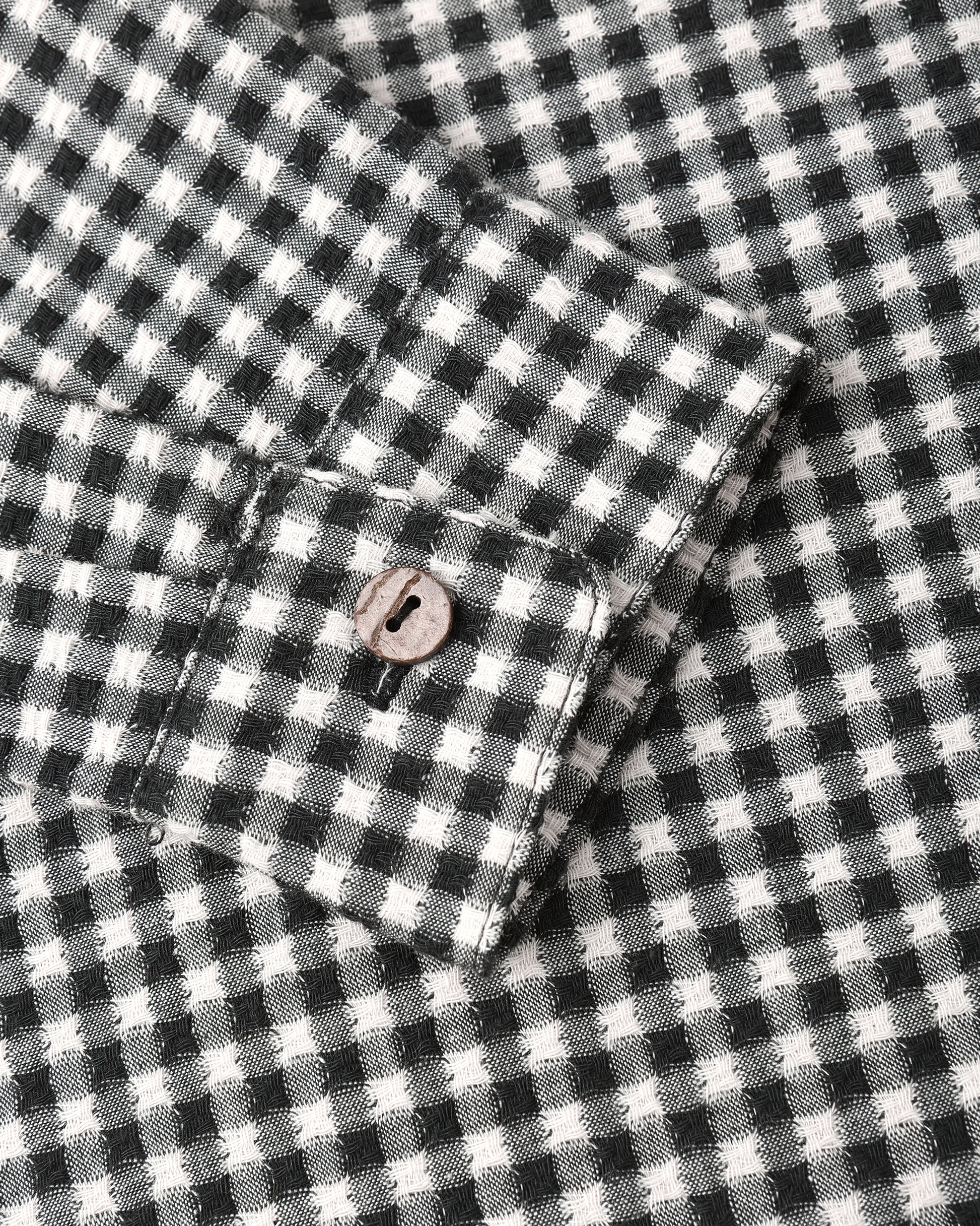 This collared long sleeve shirt features a classic black and white gingham pattern crafted from 100% cotton for breathable comfort. Delicate brown wood buttons run down the front, adding a warm, natural touch to the design. A small front pocket provides subtle utility while maintaining the shirt’s refined look, making it an expert choice for stylish and comfortable everyday wear.