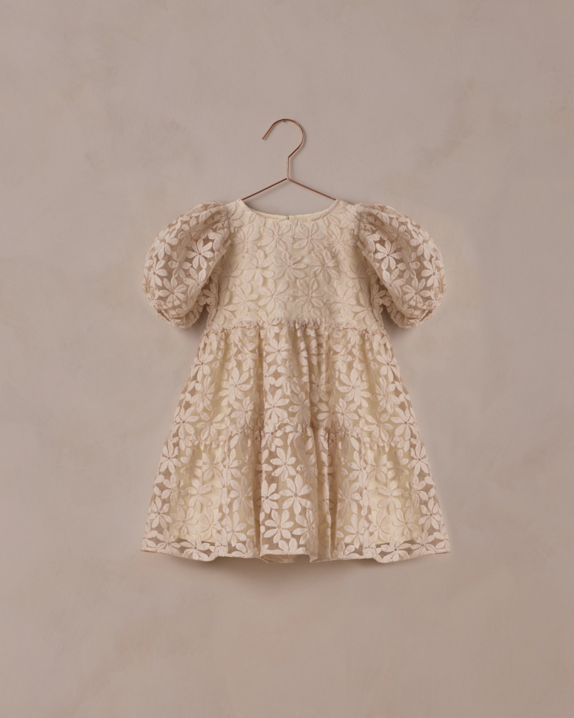 This dreamy, midi-length dress features a layered tiered skirt, full puff sleeves, and a delicate teardrop back closure, perfect for your special occasions. Coordinating bloomers included with size 2Y.