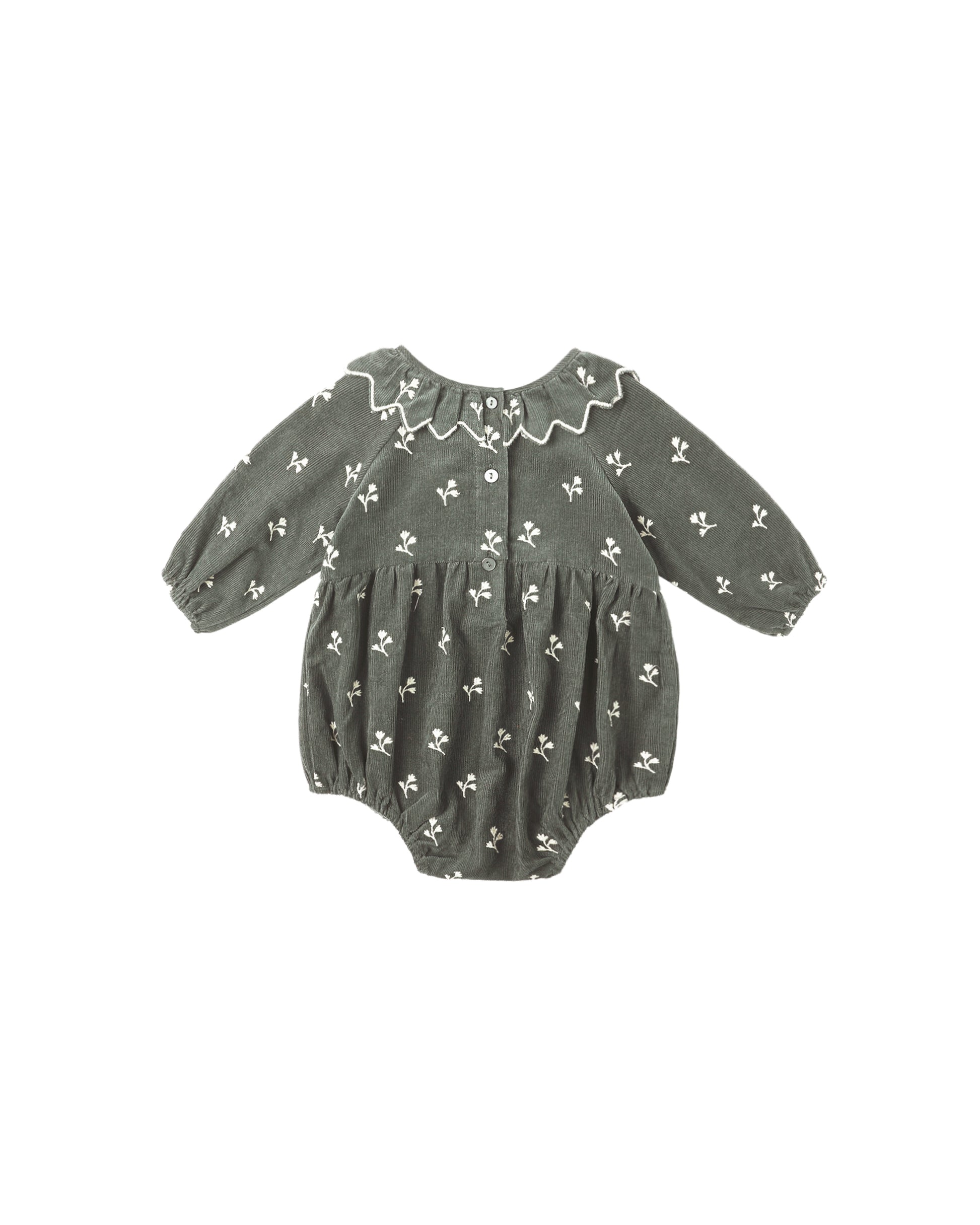 Our Freya romper features a gathering on the bubbled body, leg openings, and sleeves, plus a ruffled collar and button backing.