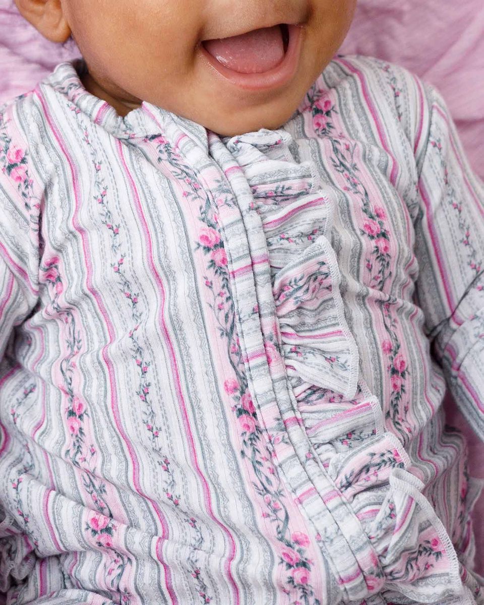Our signature viscose from bamboo ruffled footie will be your favorite go-to. With a ruffle down the front and ruffles on their bottom, our footie can be adorable jammies or your babe's outfit for the day! Add a matching headband and you're off. Our double zipper option makes diaper changes simple at all times of the day (and night). Zip from top or bottom without undressing your babe. Footie grips in Lev's signature hearts, cuffs on newborn and 0-3m to avoid scratching their sweet faces and our snug fit will ensure the best dressed and most snuggly babe ever!
