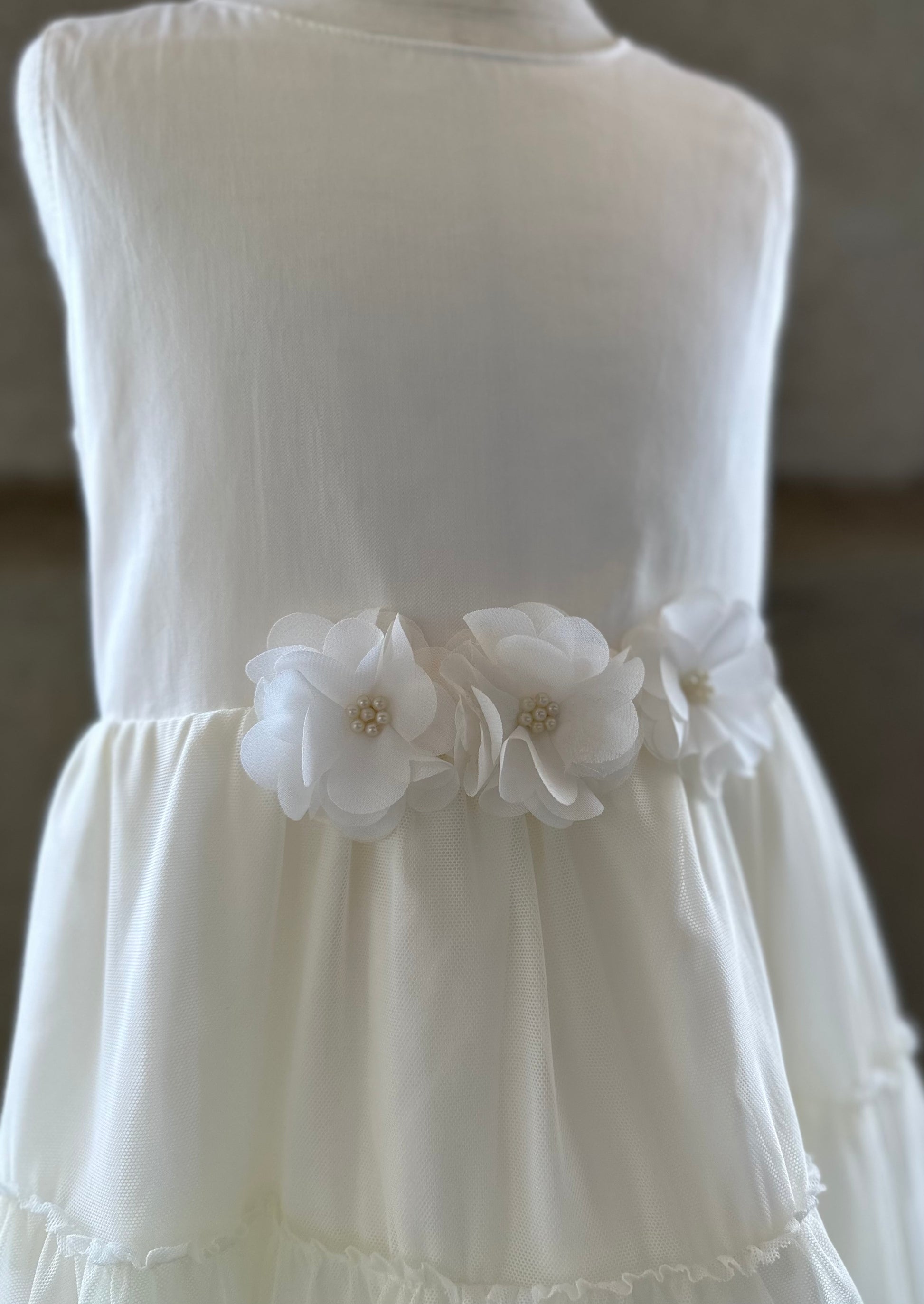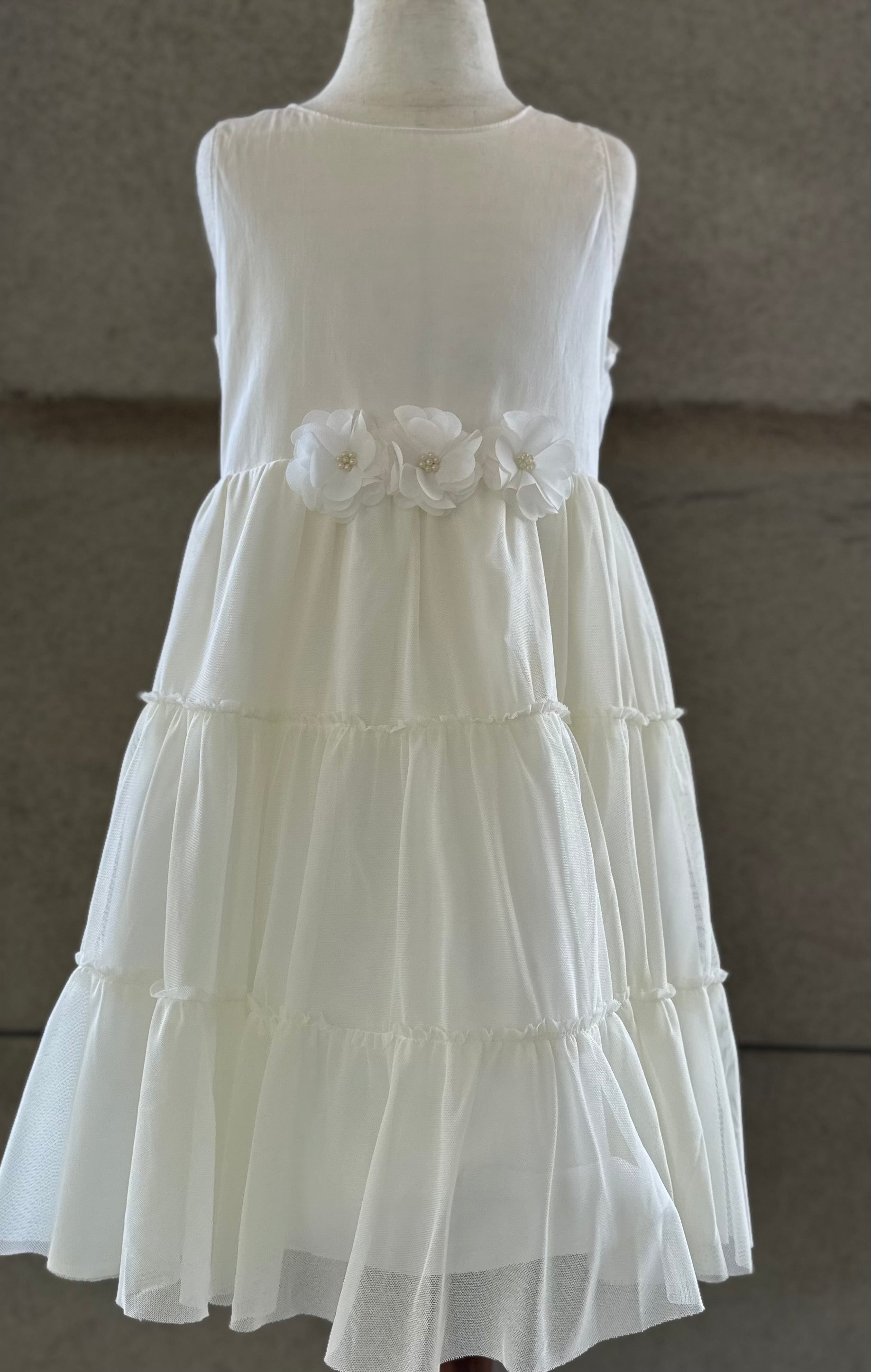 This dress is perfect for a garden wedding simple but sweet. Cotton fabric with tulle overlay skirt organza flowers at waist pearl center designed in Brazil machine wash inside out hand wash cycle hang to dry