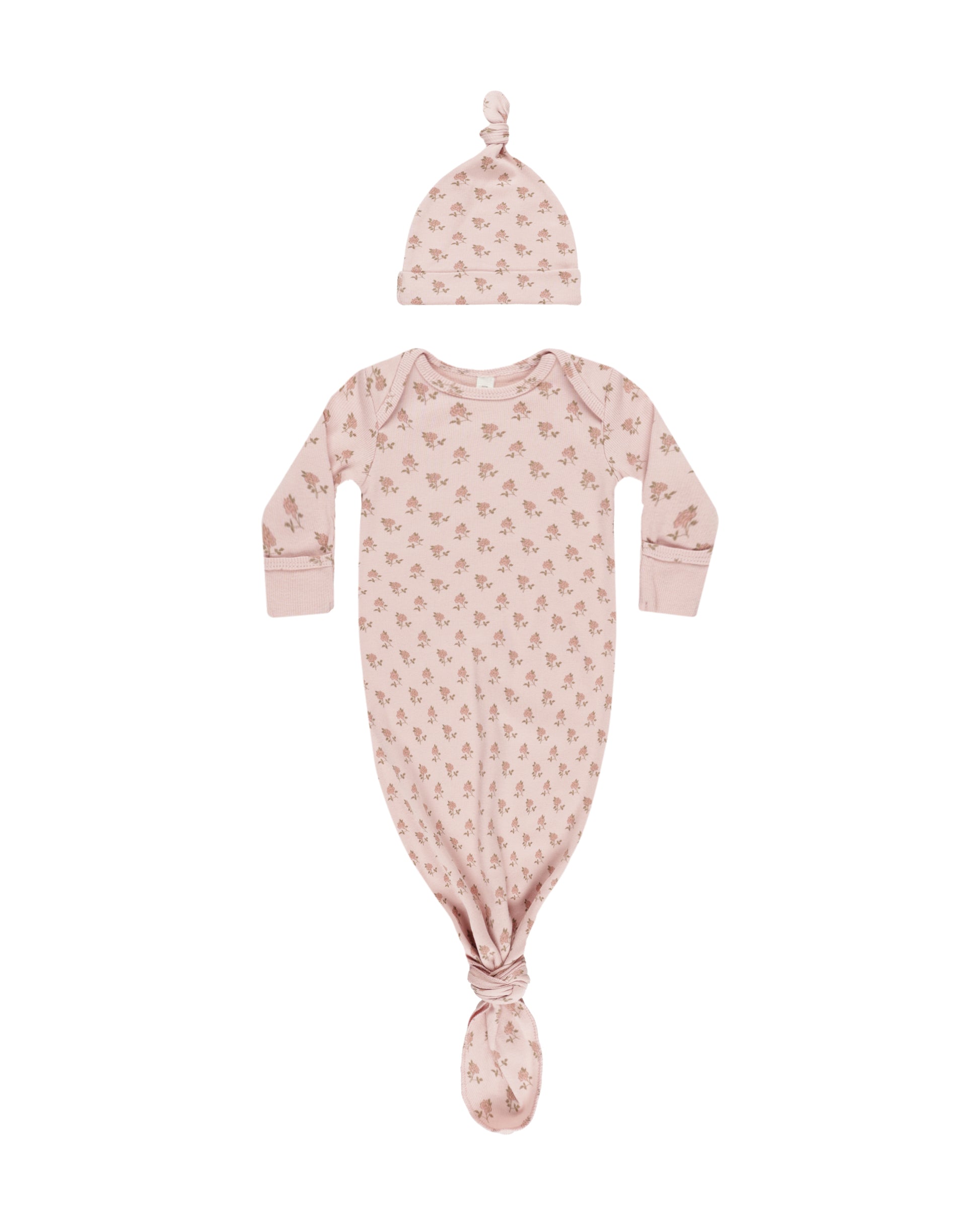 Knotted baby gown designed with fold over hand mitts, paired with our knotted baby hat in our stretchy rib knit.