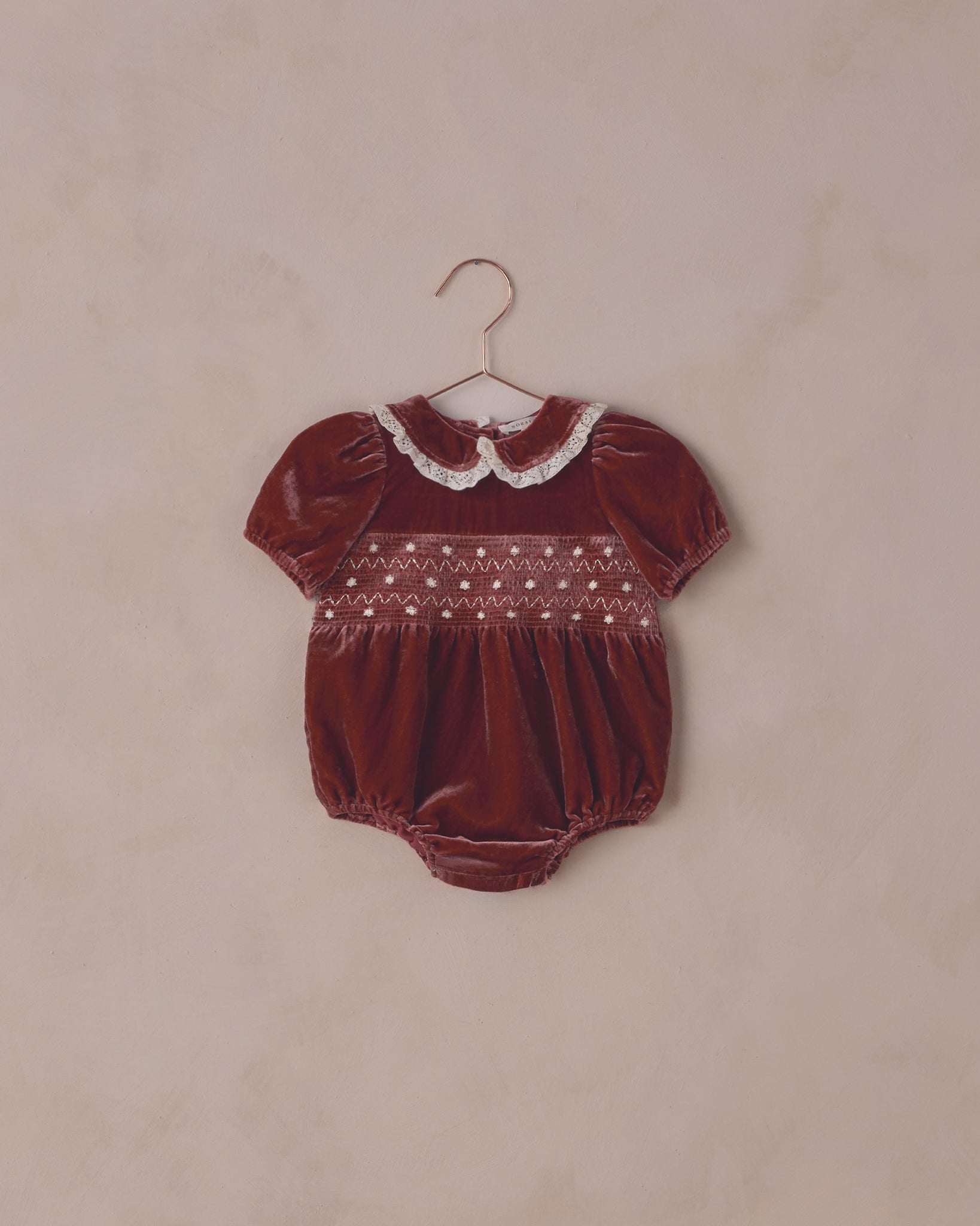 The Elizabeth Romper features a smocked bodice with dainty embroidered details, puff sleeves with lace trim, and a scalloped lace Peter Pan collar. Crafted in soft velvet, this timeless silhouette evokes a sense of tradition and nostalgia, making it the perfect keepsake dress for special occasions and holiday gatherings.