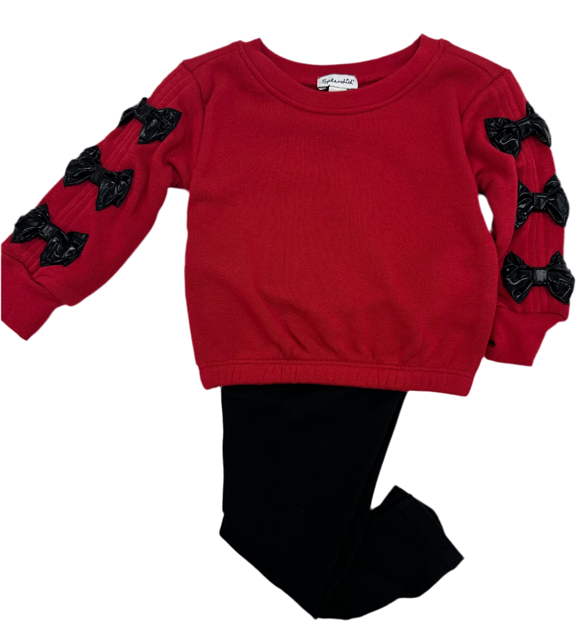 This shiny bow sweatshirt set features a cozy knit fabric and festive shiny bows adorning the sleeves.