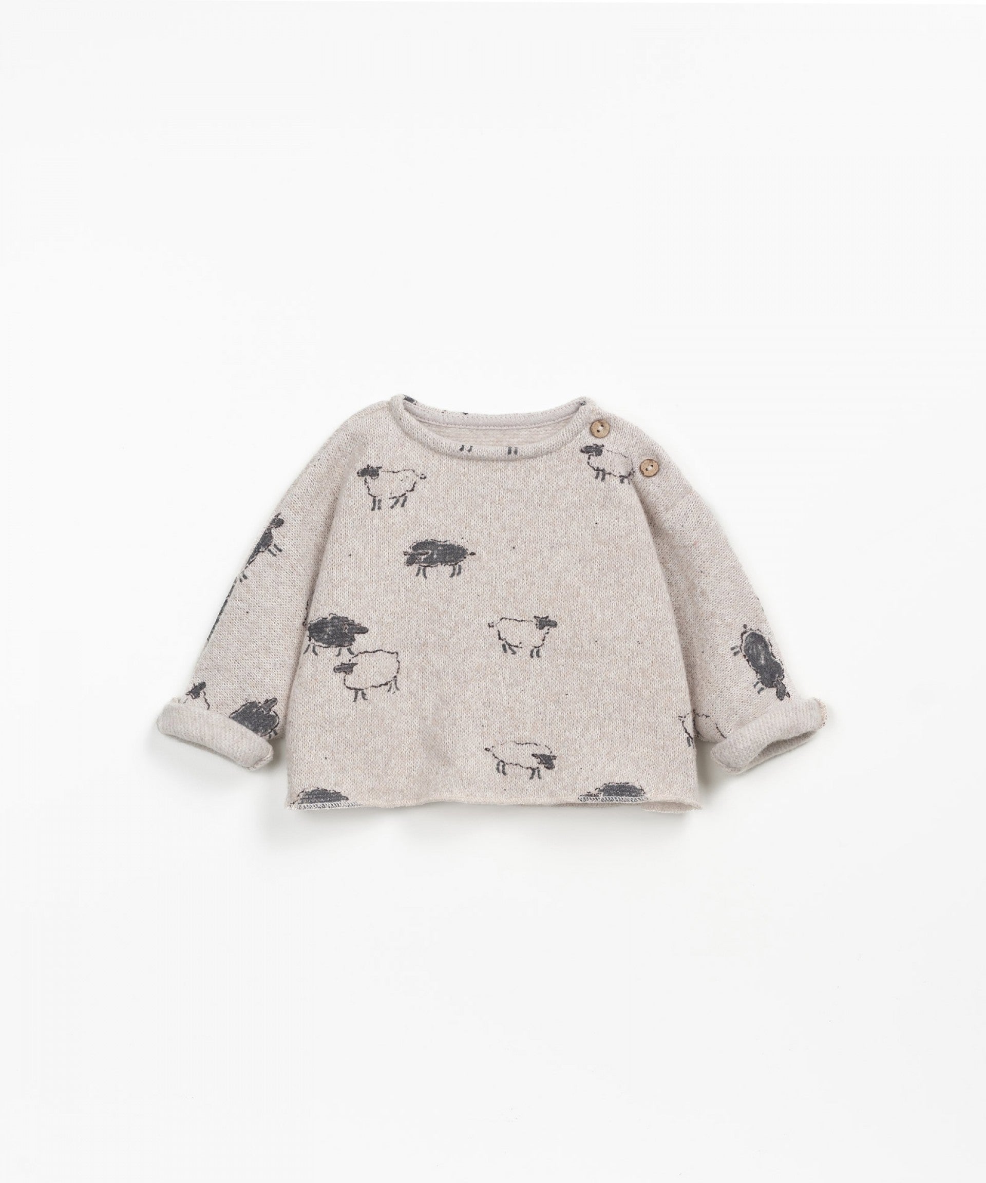This jersey sweater is made with a mixture of recycled fibers, So-So color, and contains x% of our Re(Play) recycled yarn. The model has long sleeves, a round neckline, an opening on the shoulder with coconut buttons and our sheep print.