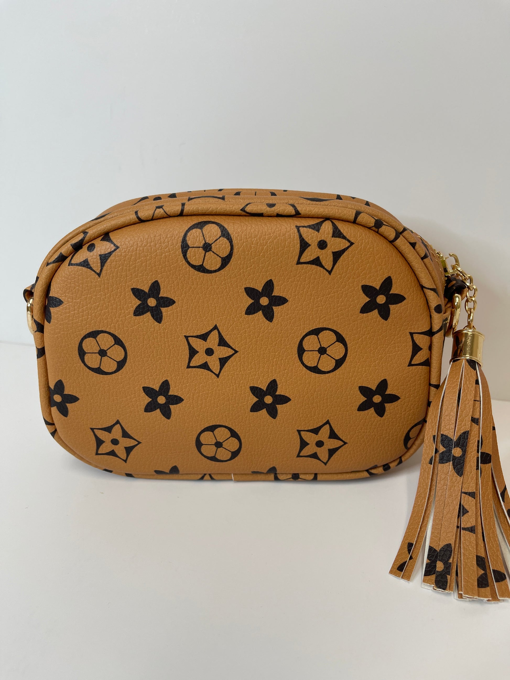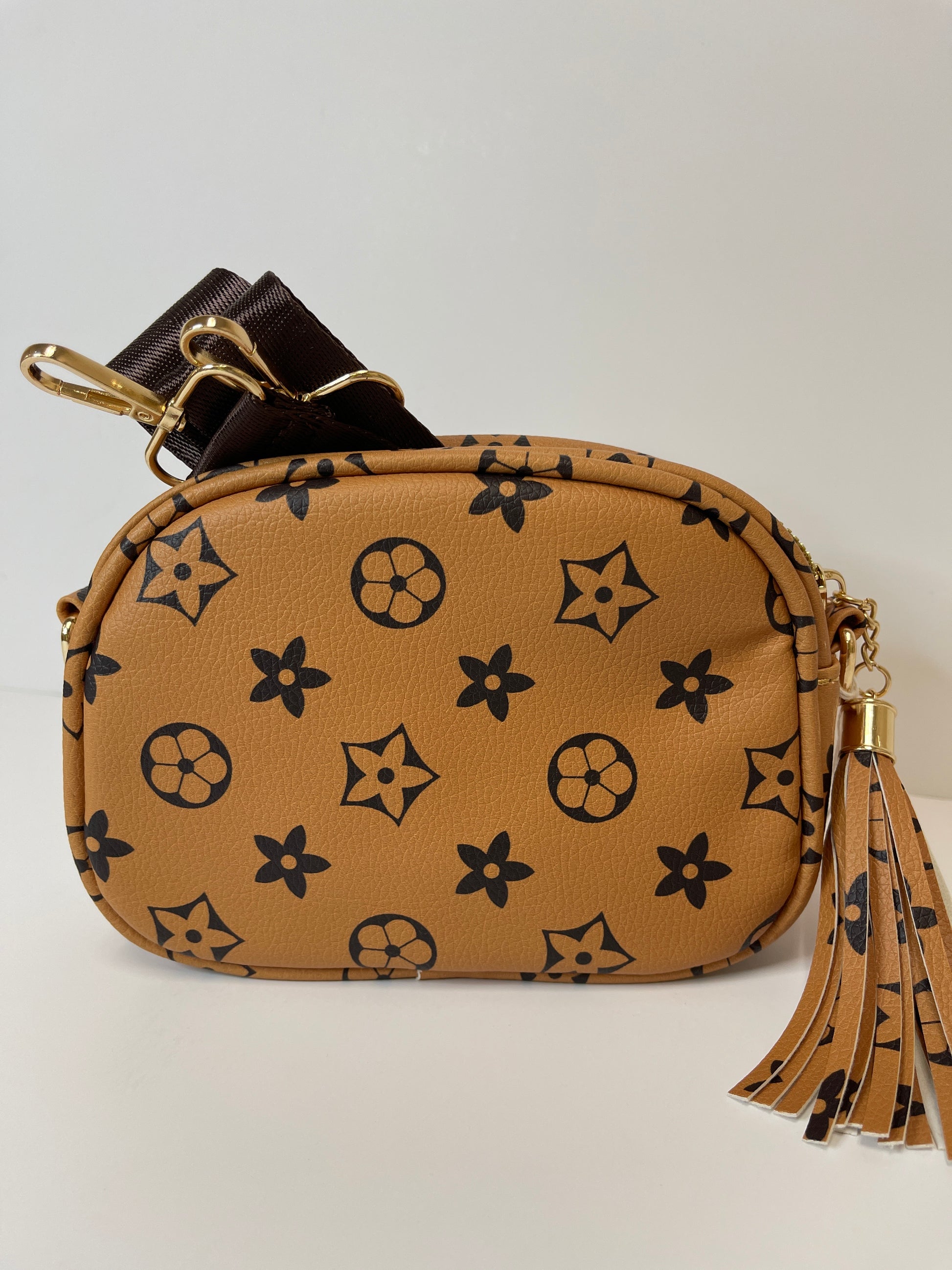 Brown and tan designer inspired purse with brown crossbody strap
