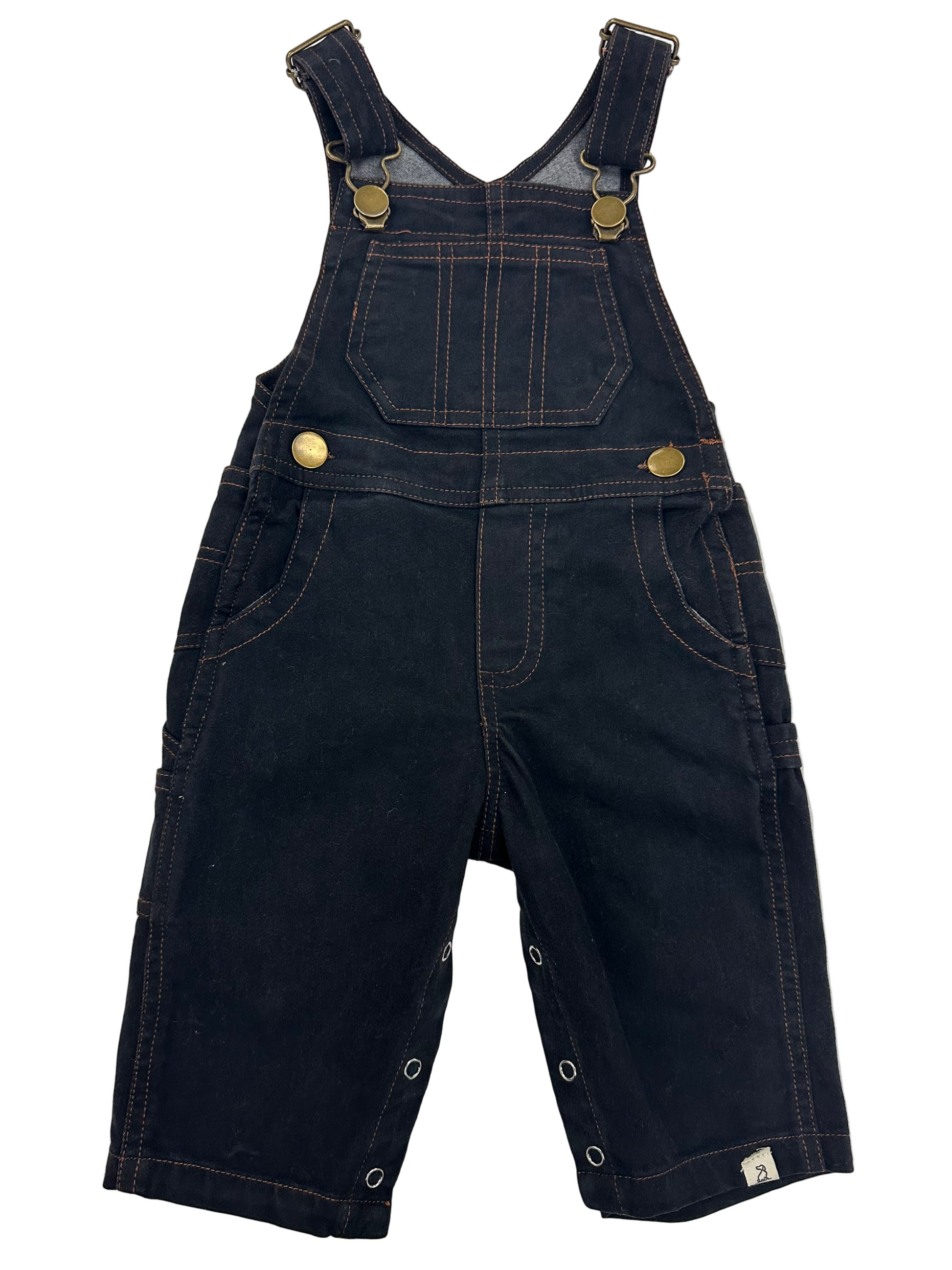 Washed Black Overalls with Tan Stitching Classic overalls get a modern twist with crisp tan stitching that pops against the soft washed black fabric. Bronze side snaps and sturdy snap-closure pockets keep everything secure while your little one plays hard. Durable, comfortable, and ready for adventure—from sandbox days to family outings.